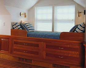 This bed is built into the eaves of and attic. It has a nautical feeling. The single bed and built in drawers are a very smart uses of the space. For more pictures of this space see my past post "Attic Transformation"
