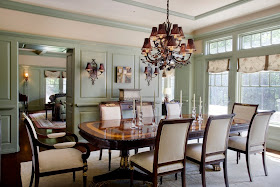 The gorgeous living room has all the architectural features to make it a showplace: limestone fireplace, curved large windows, beautiful mouldings. Here the mouldings have been painted a soft seafoam, rather than white and become more prominent in the room. Paint is great tool to use to call more attention to a wonderful feature in your room - who could forget the black painted mantel from the movie It's Complicated (photo link here)? The dining room color echos the living room colors and provides a beautiful flow. Also notice the light fixtures. I love sconces in a dining room. They provide ambient light that can really help create a spectacular atmosphere. Also notice how the beautiful windows are not covered with heavy draperies, but allow the light to flood the room.